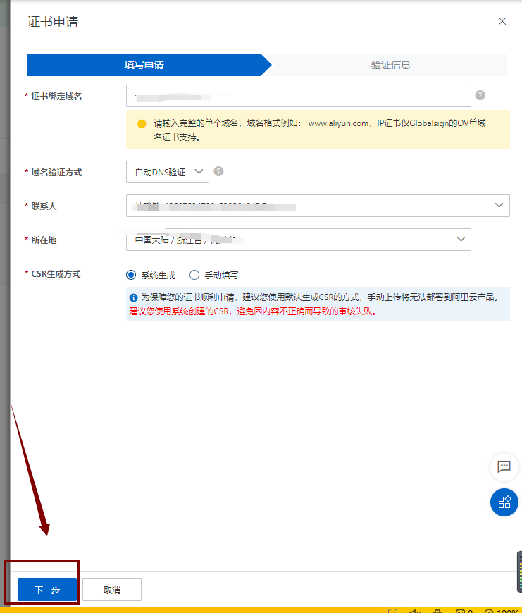 5、下一步-验证-提交审核。(如果你申请证书的域名不在该账号,你需要在域名的管理里,添加一条特定的 DNS 记录,按照以下信息添加)