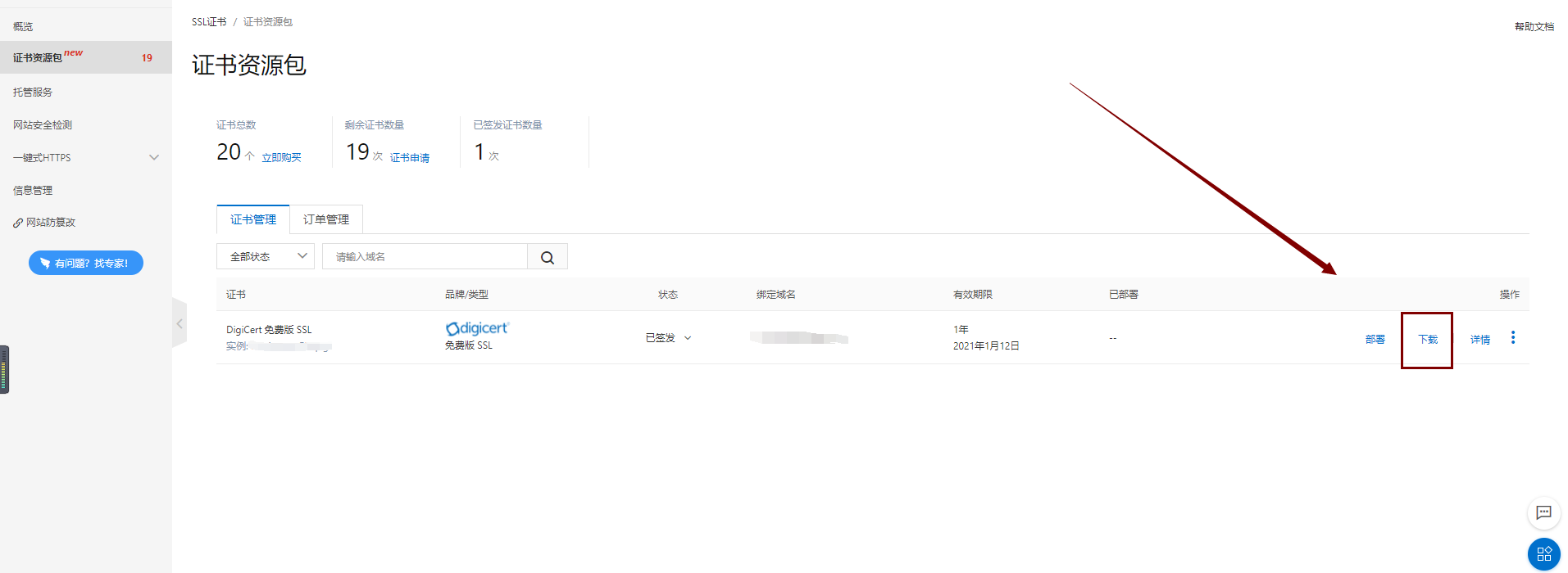 4、返回SSL证书,找到购买的证书,点击证书申请